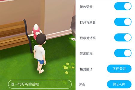 3、點擊右上角的“設(shè)置”圖標(biāo),我們就會獲得一個設(shè)置功能列表,包括了接收語音、打開背景音、顯示對話框、顯示昵稱、接受邀請等,大家可以根據(jù)自己的實際情況進行開啟或關(guān)閉。