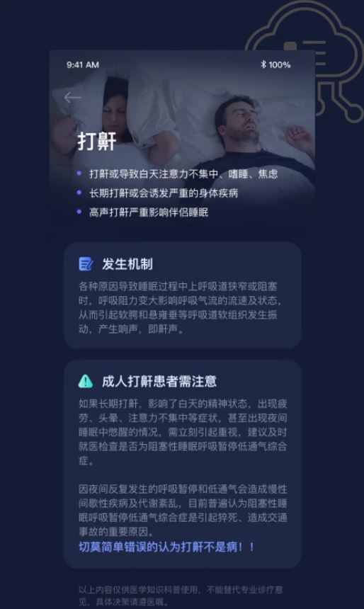 提供打鼾科普知識,幫助用戶了解打鼾的原因和影響,提供相關的改善方法和建議。