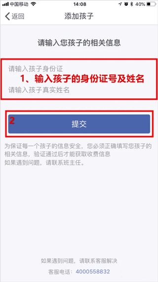 2、填寫(xiě)您孩子正確的身份證號(hào)和姓名,完成后點(diǎn)擊【提交】。