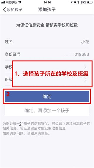 3、選擇孩子所在學(xué)校和班級(jí),完成后點(diǎn)擊【確定】。