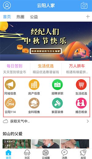 1、在本站下載安裝云陽人家app,在手機上運行軟件,可以看到有首頁、社區(qū)、云城圈、消息、發(fā)現(xiàn)五個板塊;